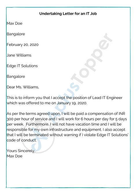 Undertaking Application Letter - Clear understanding of legal implications and jurisdiction. Add the exact terms of conditions and any other relevant information. The sample of undertaking letter format serves as a legal agreement between two parties and outlines the specific terms and conditions of the agreement. The letter of undertaking format in word should include the introduction, purpose, obligation, term, termination, governing law, and..
